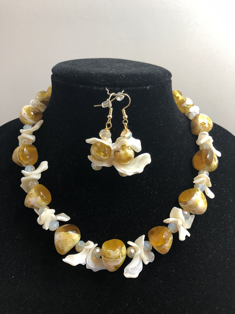 This ELEGANT amber and shell mix statement necklace adds a bold pop to any outfit! It can easily be worn to dress up a classic top, dress or suit, or to add to a more casual look…