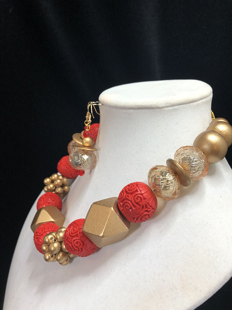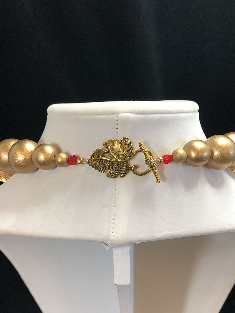 This BEAUTIFUL antique hand-carved cinnabar red Chinese bead makes this piece so special! The Chinese bead mixed with wood makes this statement necklace add a bold pop to any outfit! It can easily be worn to dress up a classic top or dress, or simply paired with jeans and a tee shirt.