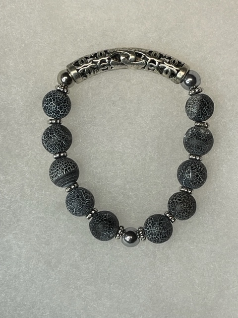 Materials: Stretch Elastic, Black Cracked Stone Beads, Silver Metal Connector, Silver Bead, Silver Spacers