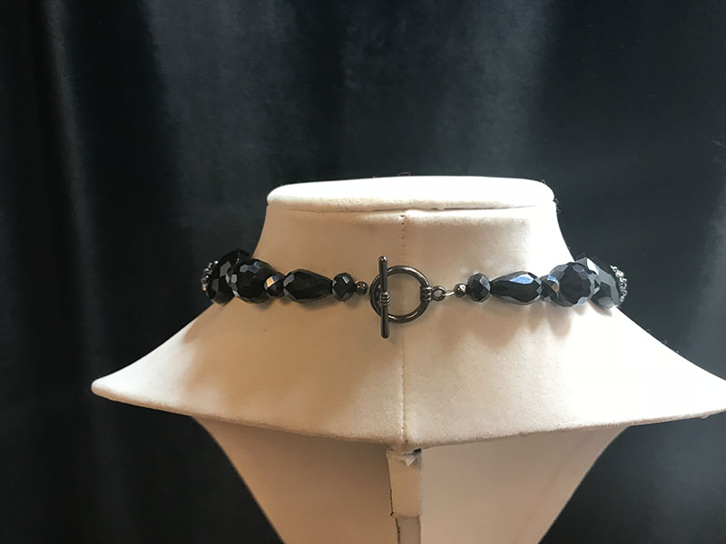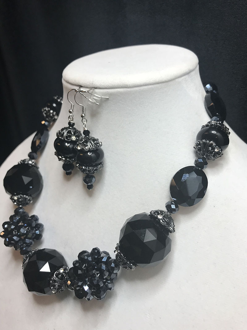 This GORGEOUS black and pewter glass bead statement necklace adds a bold pop to any outfit! It can easily be worn to dress up a classic top or dress for an elegant evening on the town. Made from weighted glass beads and strung on strong wire.