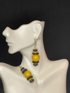 The gold wood bead is framed with layered black wood disks for an Ethnic look.